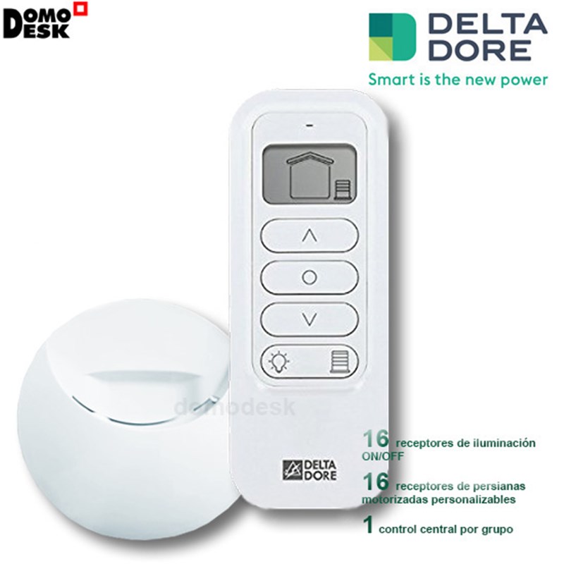 Controla la iluminación en Marcha/paro y las persianas motorizadas en las posiciones Subir/Parar/BajarCentraliza el control de 16 receptores de iluminación Marcha/paro y de 16 receptores de persianas motorizadas personalizables + 1 control central por grupo