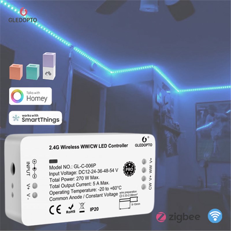 Cambio de temperatura de color: 2000K - 6500KTensión de entrada: DC 12-24 voltios (no incluye adaptador de corriente)Corriente de salida total: Máx. 5 amperios a 12-24VDCClase de protección: IP20Temperatura de funcionamiento: -20°C a 60°CProtocolo RF: Zigbee 3.0
