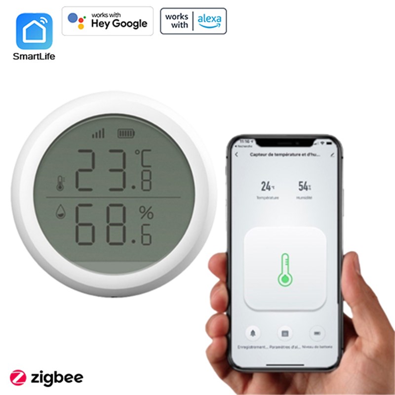 ZigBeeTermómetroHigrómetroPantalla LCDPuede ser :Colocado en un mueble con el soporte suministradoSe fija a la pared con la cinta adhesiva de doble cara suministradaFunciona con 2 pilas alcalinas LR03 / AAA (no incluidas)Dimensiones: 6,12 cm (diámetro) x 2,3 cm (grosor)Temperatura de funcionamiento : De -10°C a 55°CHumedad de funcionamiento: de 0% a 99% sin condensaciónSe puede utilizar desde cualquier parte del mundo con la aplicación para smartphones Tuya Smart Life a través de la pasarela Tuya ZigBee WiFiCompatible con Homey / Homey Pro (a través de la aplicación Tuya ZigBee)Compatible a través del dongle USB ZigBee Zigate:Jeedomeedomus+Domoticzetc.2 años de garantíaRetire la película protectora de plástico de la pantalla (da la impresión de que la pantalla está rayada).