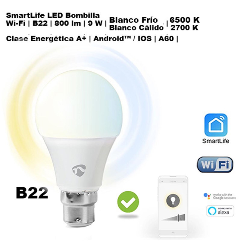 Bombilla LED intelligente blanco cálido a frío B22 Smartlife Wifi