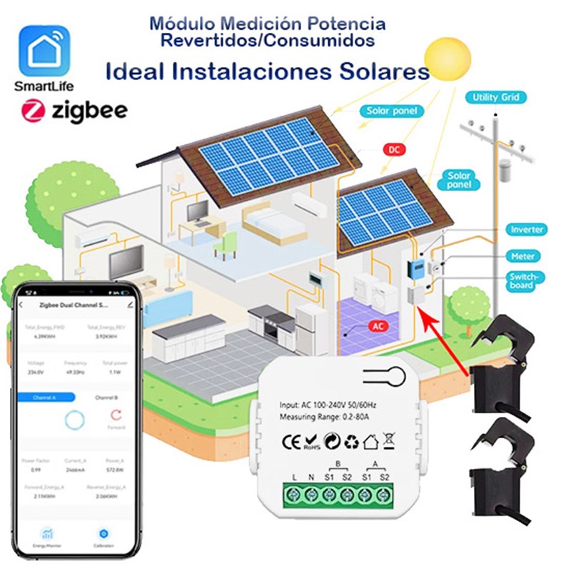 Domodesk les ofrece un dispositivo SmartLife Zigbee que basicamente es un módulo de 2 canales para potencias revertidas y consumidas, dos canales, con pinzas amperimétricas hasta 80A, el producto es ideal para instalaciones solares donde necesitemos saber el dato de energía inyectada a la red.