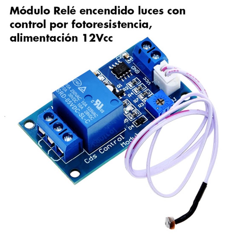 El módulo del sensor de relé fotorresistor o fotocelula (LDR) crepuscular está equipado con un relé de alta potencia, que puede controlar una carga de corriente de 10A; también viene con un sensor fotorresistor, se alimenta a 12V cc.