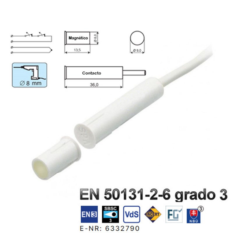 Imán Neodymium (NdFeB)GAP en material no magnético: 16 mmMontaje en materiales magnéticos sólo con accesorios opcionalesAntisabotaje (sabotaje 5 mm en materiales no magnéticos)Carcasa de plástico ABS color blancoTemperatura de funcionamiento de -40ºC a +70ºCGrado de protección: IP67Contacto: 48V CC / 500 mA / 10 VADiámetro: diam. 8 mmDimensiones del conector: 36 (L) x 9 (diam.) mmDimensiones del imán: 14 (L) x 9 (diam.) mmCertificado EN-50131-2-6 Grado 3
