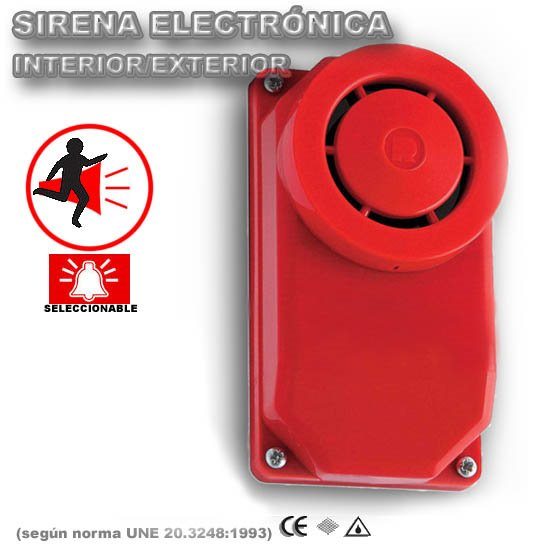 SIRENA ELECTRÓNICA PARA INTERIOR EXTERIORPotente sirena electrónica de alerta y alarma de uso interior/exterior, idónea para instalaciones autónomas contra incendios por su muy bajo consumo, así como para integrar en cualquier de sus proyectos, se dispone de equipos alimentados a 12/24V DC, o 125V AC y 220VAC, una vez realizado el pedido especifique en observaciones la alimentación deseada. Cuatro sonidos: seleccionables. Alto rendimiento acústico ya que funciona continuamente sin calentamiento. Alarmas, fuego, instalaciones autónomas, ascensores, maquinaria especial, vehículos pesados, montacargas, emergencia, carretillas, grúas, fábricas, polideportivos, almacenes, puertos, grandes superficies, aeropuertos, talleres, parkings, etc.Viene incluida la base posterior IP54 para instalación exteriorConsumo eléctrico.-230V AC 50-60 Hz 0.05A 125/110V AC 50-60 Hz 0.06A 24/12V DC 0.03 A